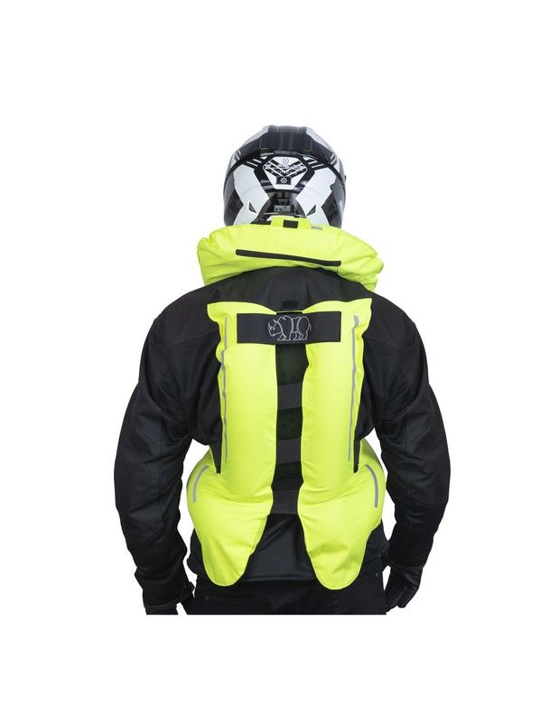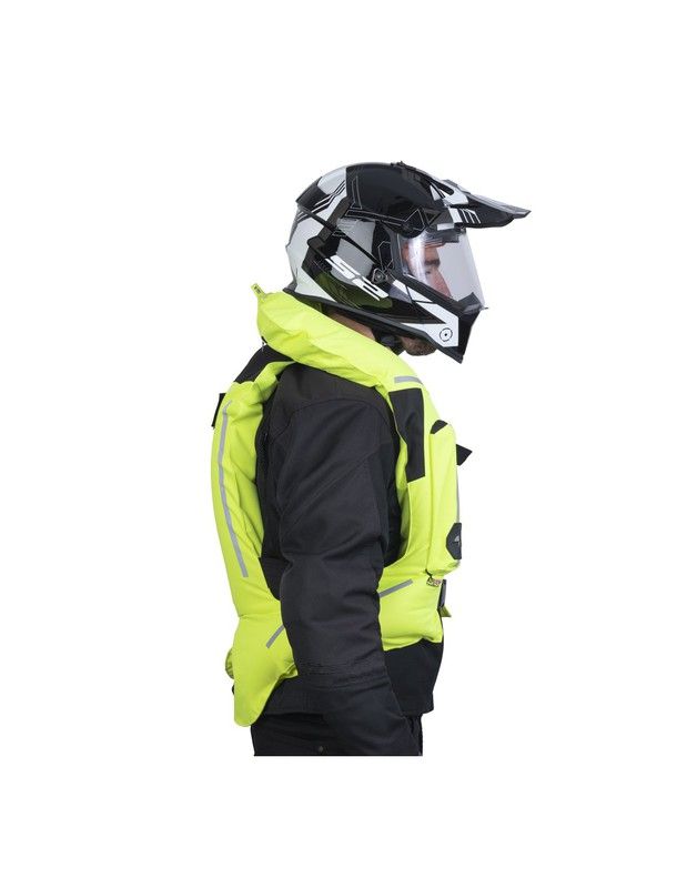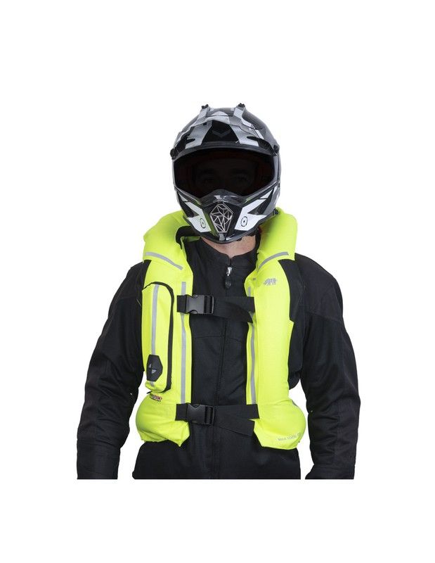 El chaleco queda conectado a la motocicleta mediante una correa que se sujeta al chasis de la moto. En caso de accidente, el sistema percutor activará la botella encargada de inflar el chaleco. La activación es instantánea, en menos de 0,35 segundos el chaleco estará inflado por completo.
