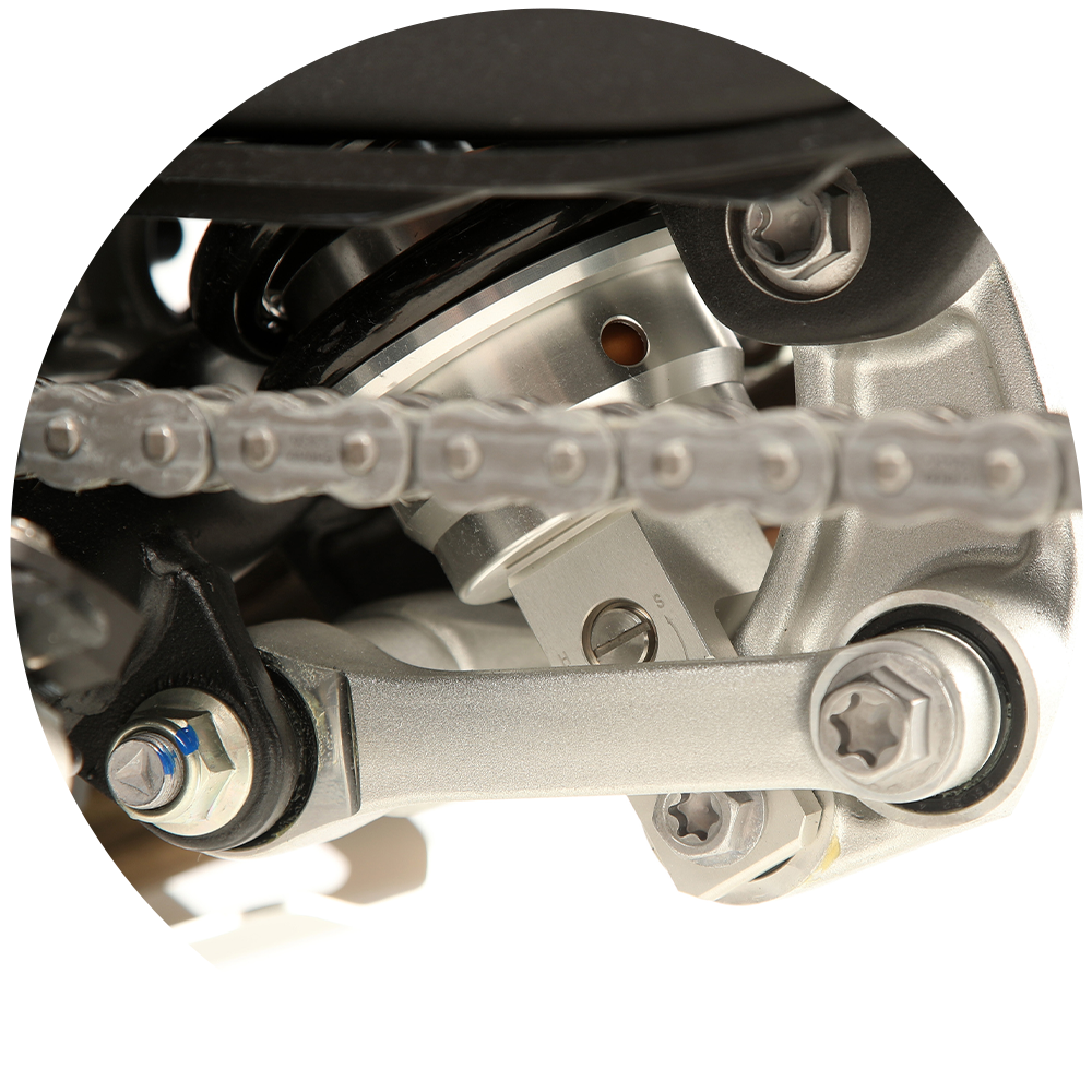 Suspensión trasera monoamortiguador Yuan tipo piggyback con recorrido de 240 mm. Multi-regulable en precarga, extensión y compresión.
